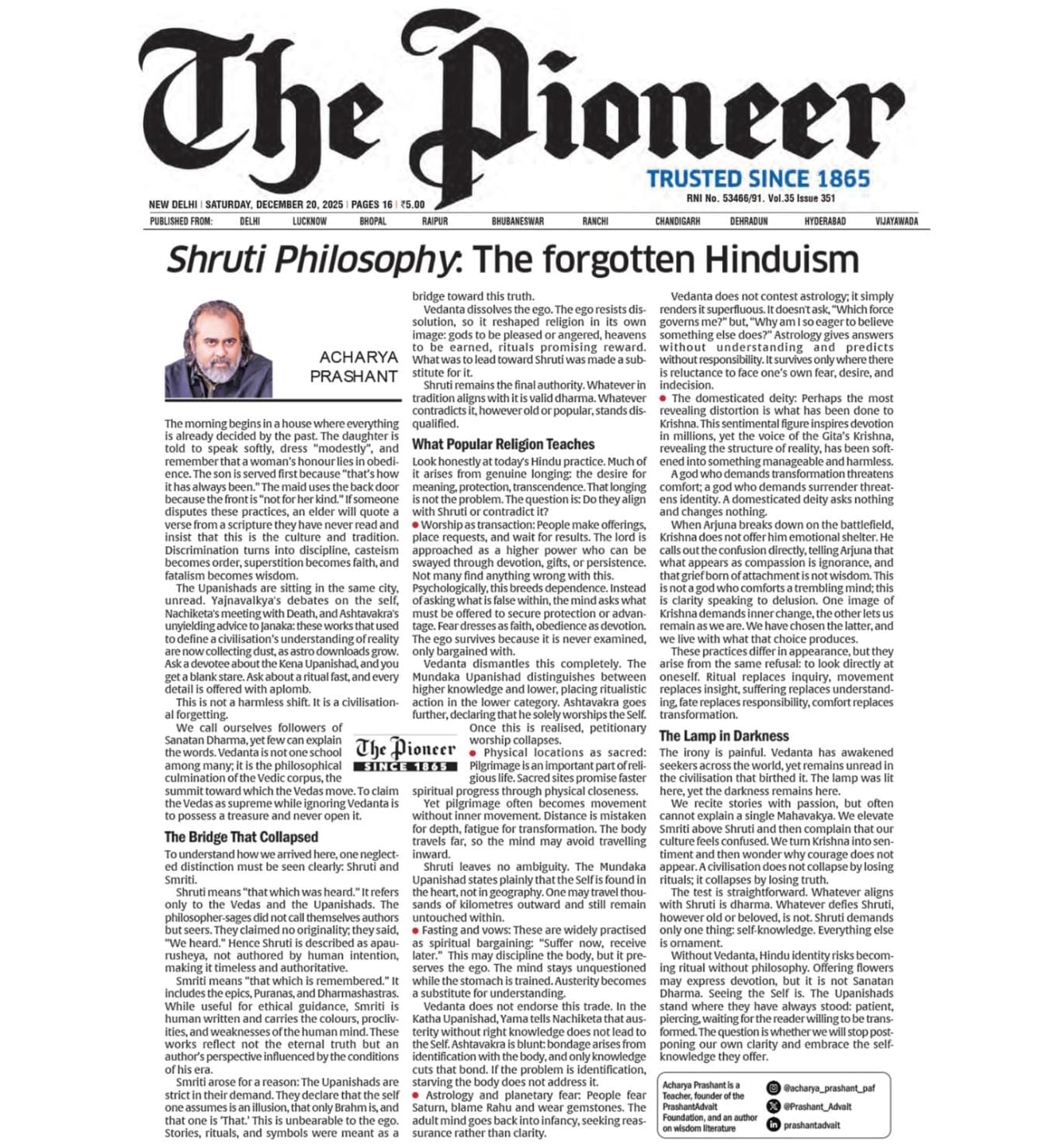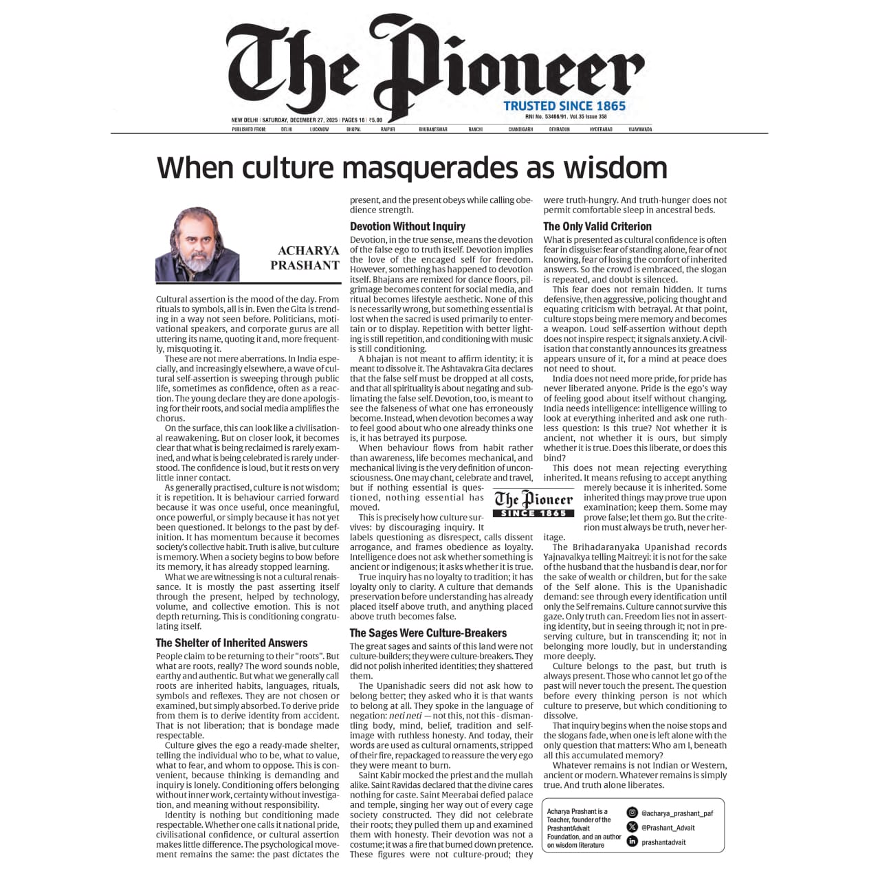 Free Press Journal - "Acharya Prashant: India’s Most Followed Philosophical Voice On Instagram"