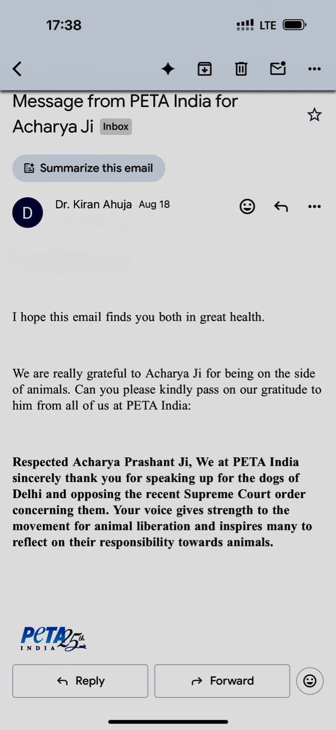 PETA reached out to thank Acharya Prashant for championing the cause of compassion to street dogs and for inspiring millions to treat animals with dignity and compassion.