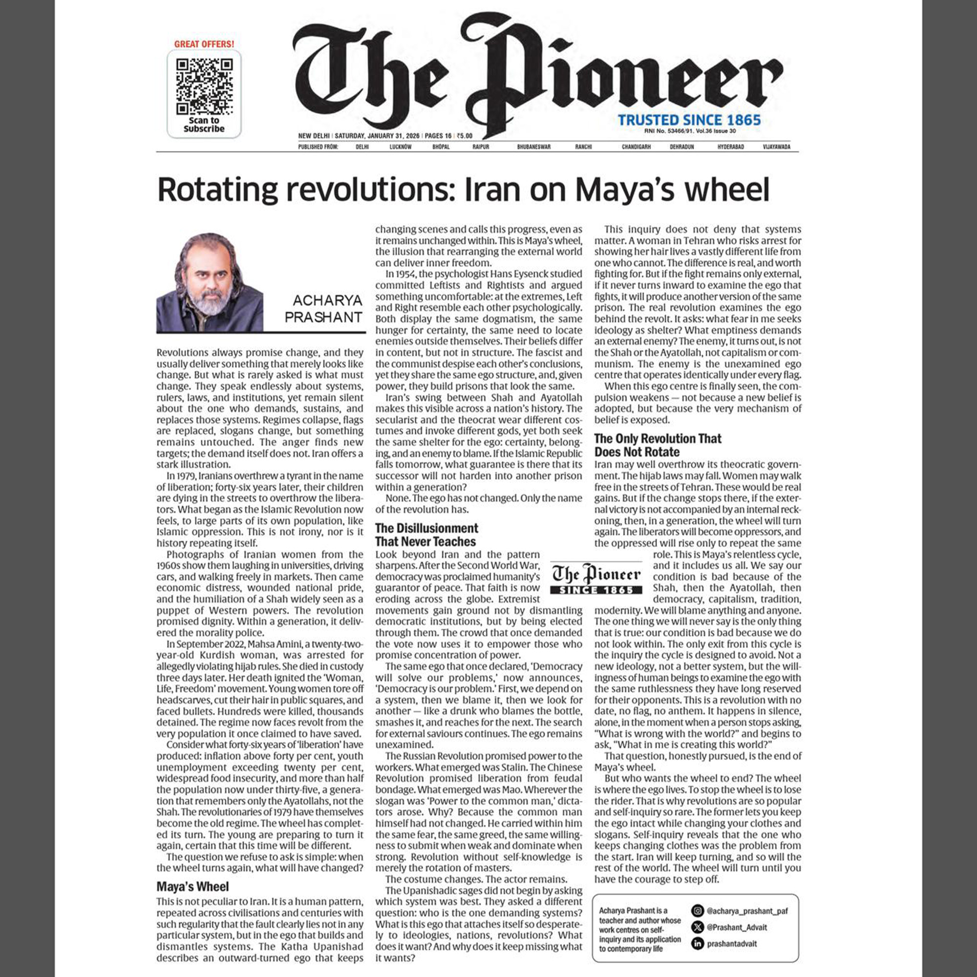 Acharya Prashant was featured in The Pioneer