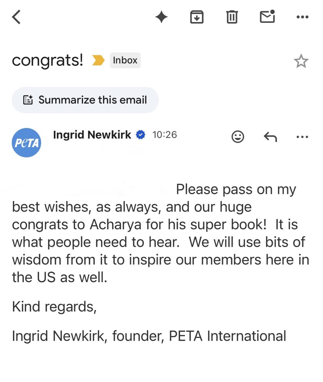 Referred and Quoted PETAPETA | Ingrid Newkirk, founder of PETA International, congratulated Acharya Prashant on his book 'Truth Without Apology', describing it as much-needed and sharing that PETA would use parts of its wisdom to inspire members in the US. 18 Aug 2025 [1] PETA reached out to thank Acharya Prashant for championing the cause of compassion to street dogs and for inspiring millions to treat animals with dignity and compassion. 18 Aug 2025 [1] |