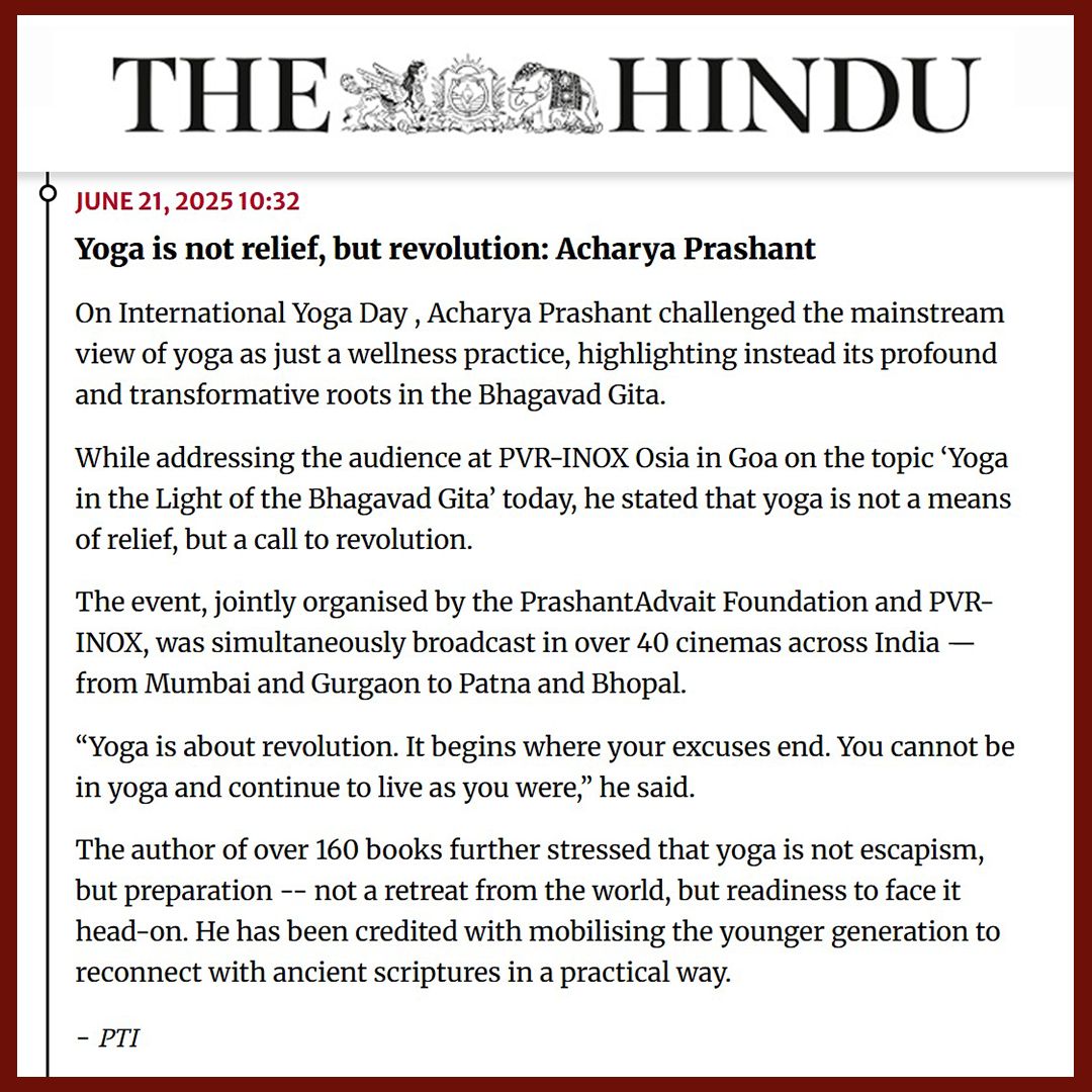 Media Acharya Prashant’s Yoga Day message from PVR-INOX featured in The Week!Acharya Prashant’s Yoga Day message from PVR-INOX featured in The Week! | |