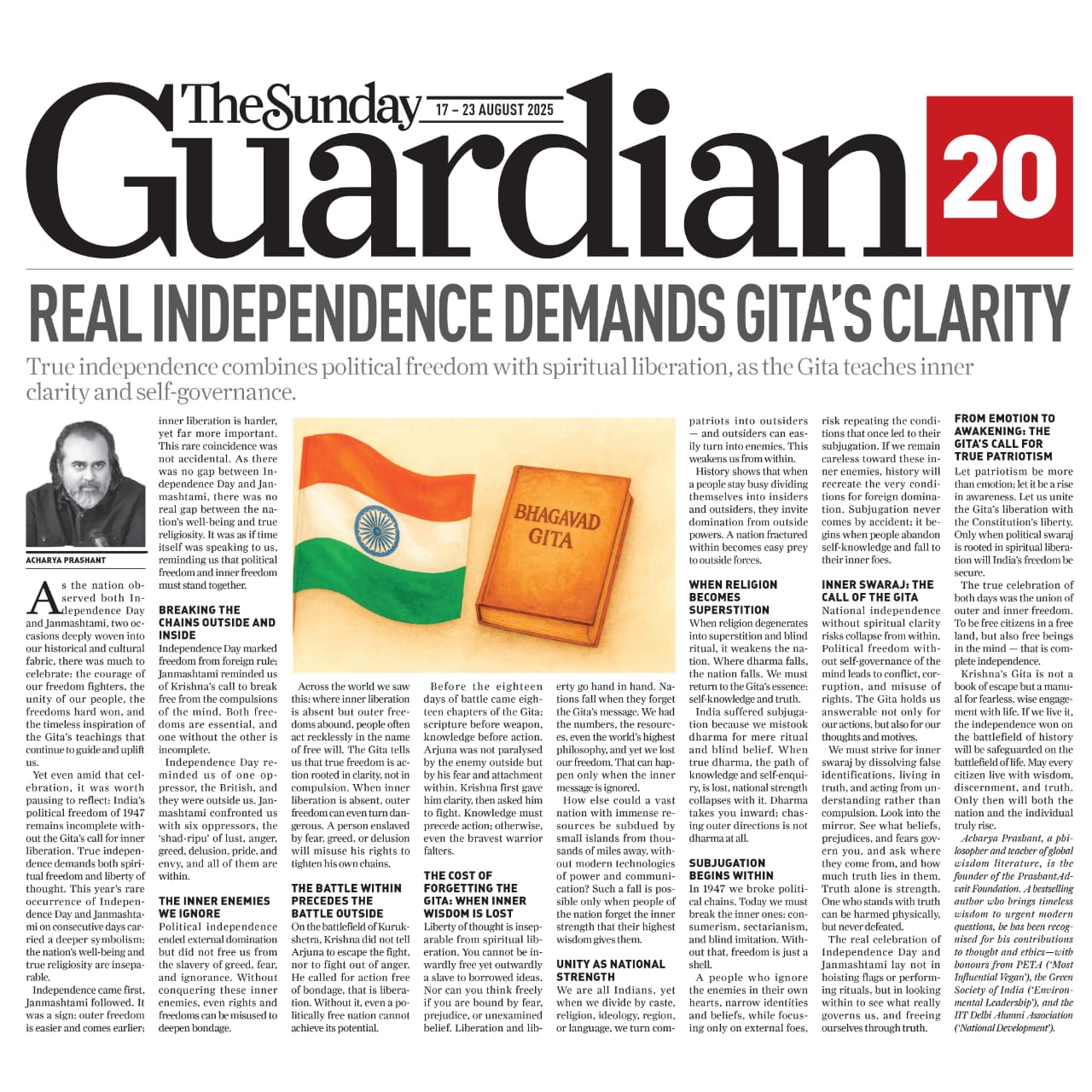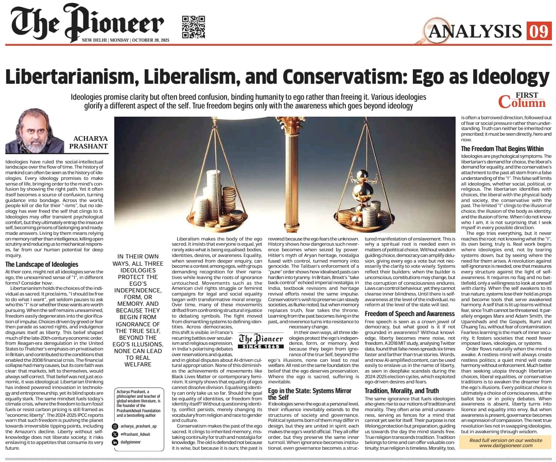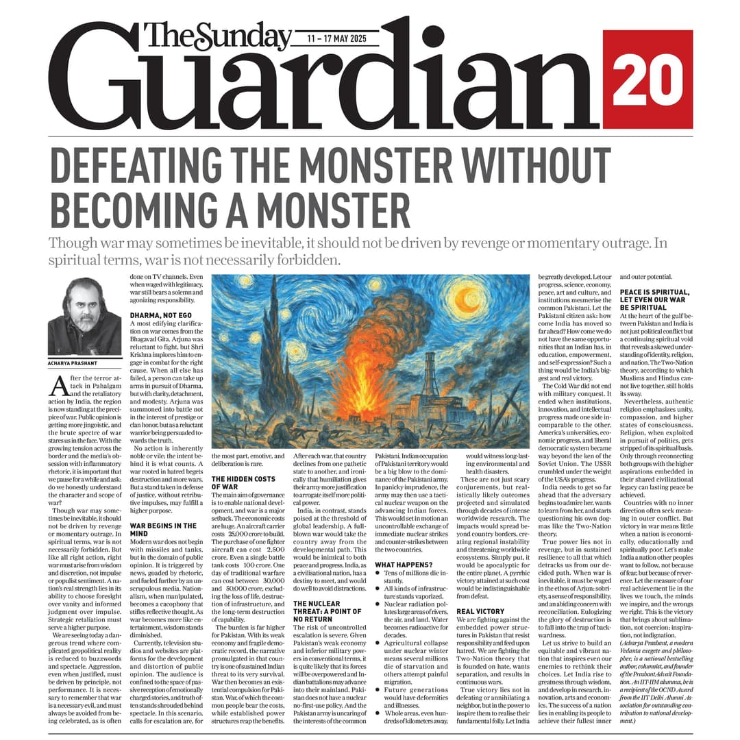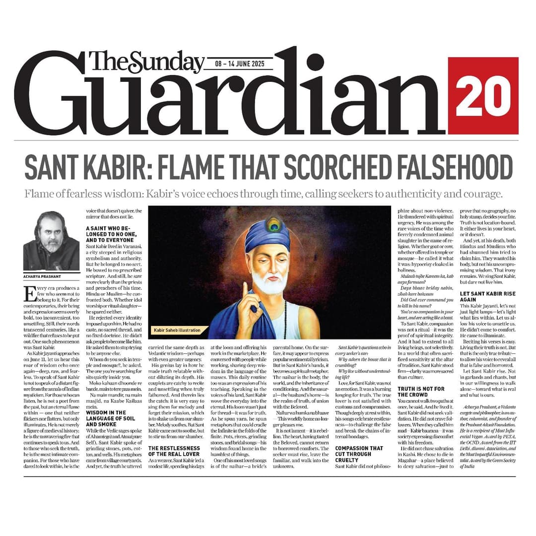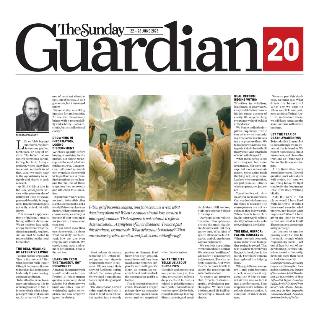 Media The Free Press JournalThe Free Press Journal | Acharya Prashant Featured Among the Top 5 Most Impactful Living Philosophers in 2025 19 Nov 2025 [1] [2] “After #1 On Amazon And Nielsen, ‘Truth Without Apology’ Now Dominates Flipkart Bestseller Charts” 24 Oct 2025 [1] [2] Free Press Journal - "Acharya Prashant: India’s Most Followed Philosophical Voice On Instagram" 20 Aug 2025 [1] [2] Seventeen Hours With The Gita: A Living Janmashtami Where PVR INOX Multiplexes Turned Into Temples Of Reflection 18 Aug 2025 [1] [2] |