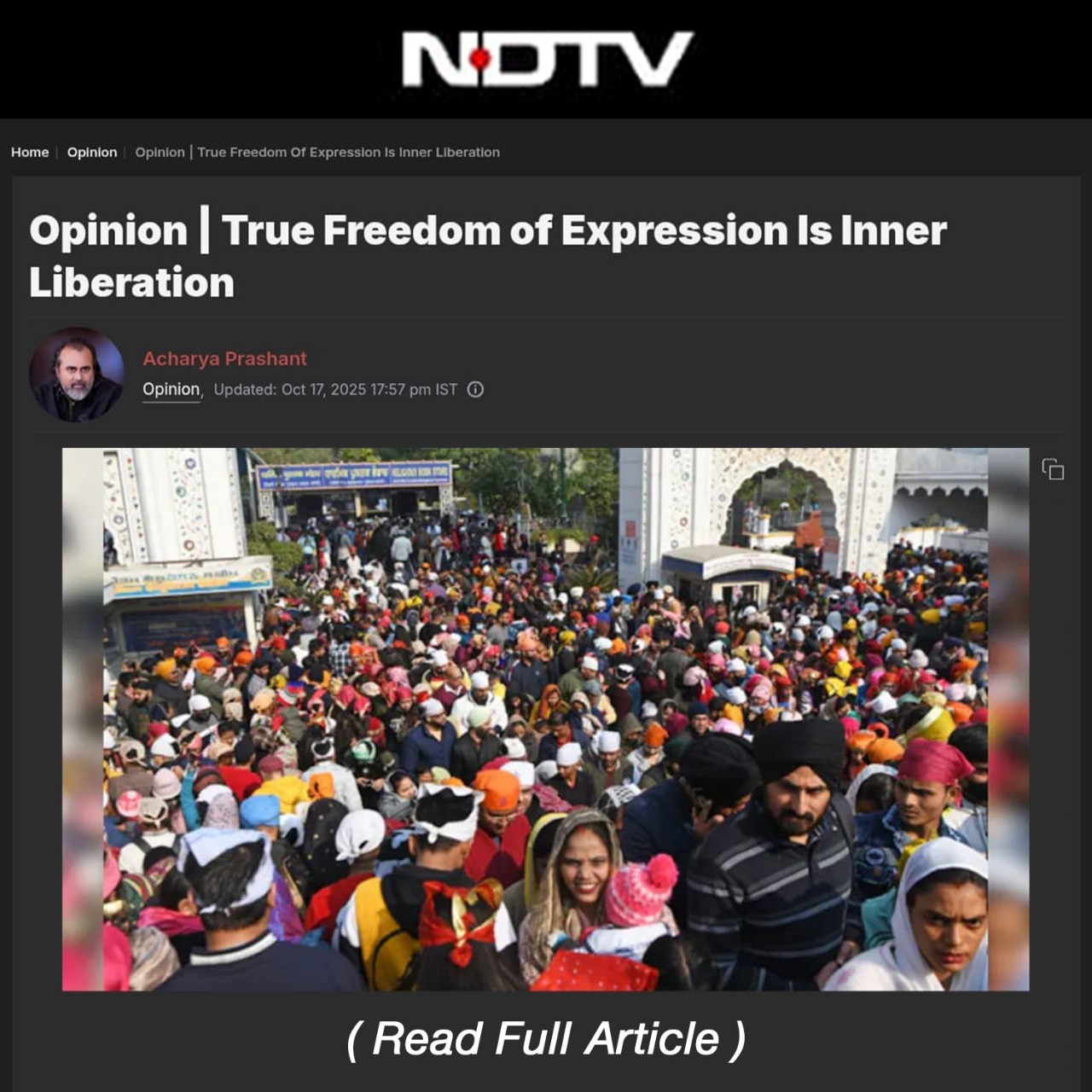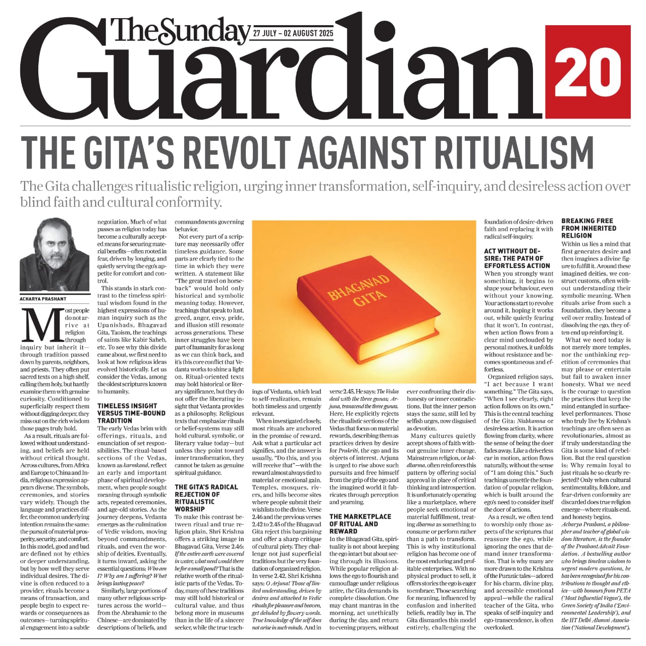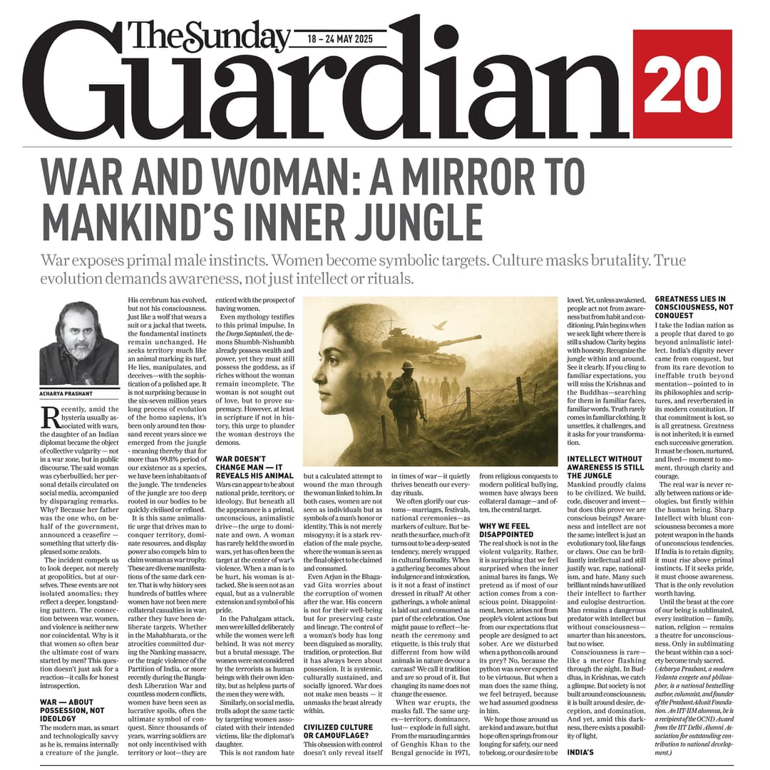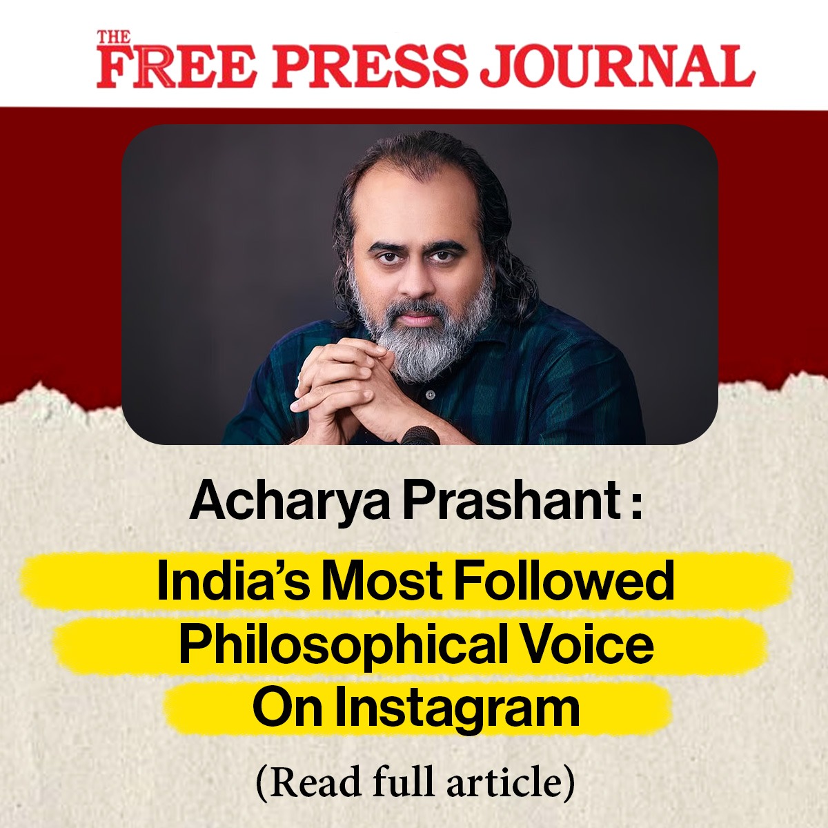 Media The Free Press JournalThe Free Press Journal | Acharya Prashant Featured Among the Top 5 Most Impactful Living Philosophers in 2025 19 Nov 2025 [1] [2] “After #1 On Amazon And Nielsen, ‘Truth Without Apology’ Now Dominates Flipkart Bestseller Charts” 24 Oct 2025 [1] [2] Free Press Journal - "Acharya Prashant: India’s Most Followed Philosophical Voice On Instagram" 20 Aug 2025 [1] [2] Seventeen Hours With The Gita: A Living Janmashtami Where PVR INOX Multiplexes Turned Into Temples Of Reflection 18 Aug 2025 [1] [2] |