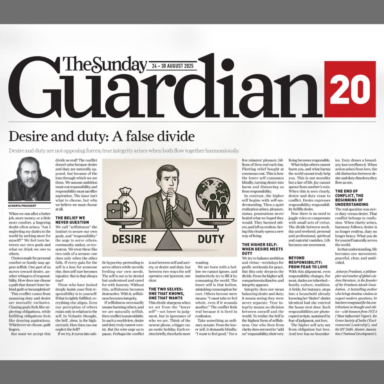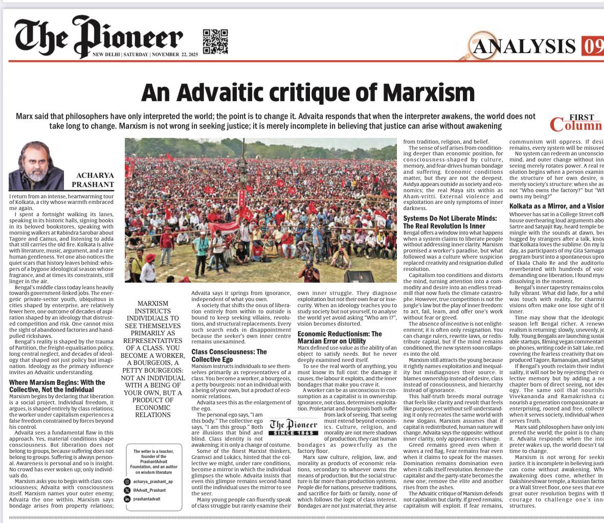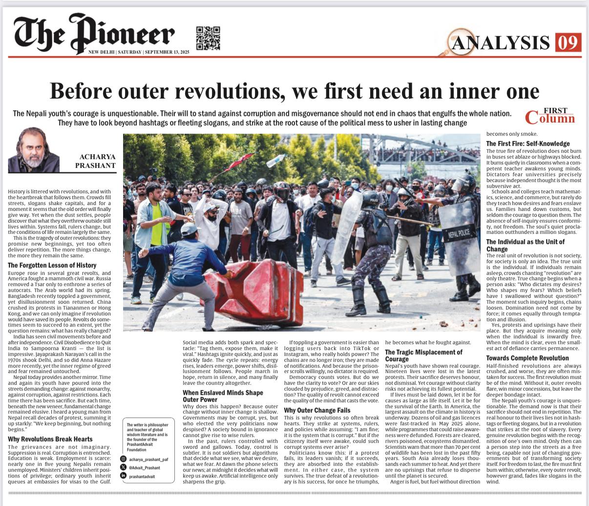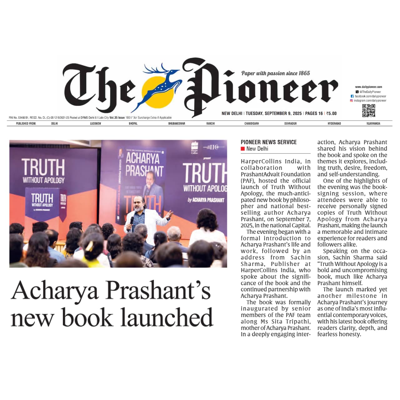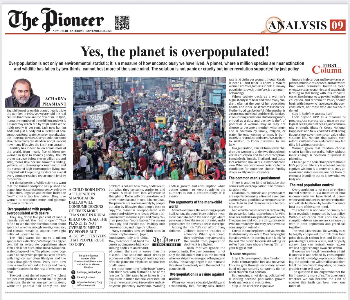 Media The Free Press JournalThe Free Press Journal | Acharya Prashant Featured Among the Top 5 Most Impactful Living Philosophers in 2025 19 Nov 2025 [1] [2] “After #1 On Amazon And Nielsen, ‘Truth Without Apology’ Now Dominates Flipkart Bestseller Charts” 24 Oct 2025 [1] [2] Free Press Journal - "Acharya Prashant: India’s Most Followed Philosophical Voice On Instagram" 20 Aug 2025 [1] [2] Seventeen Hours With The Gita: A Living Janmashtami Where PVR INOX Multiplexes Turned Into Temples Of Reflection 18 Aug 2025 [1] [2] |