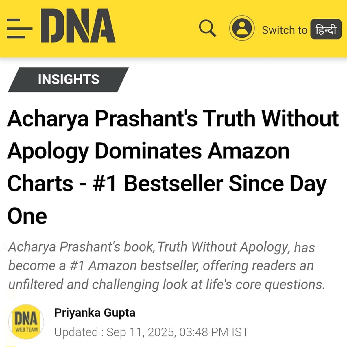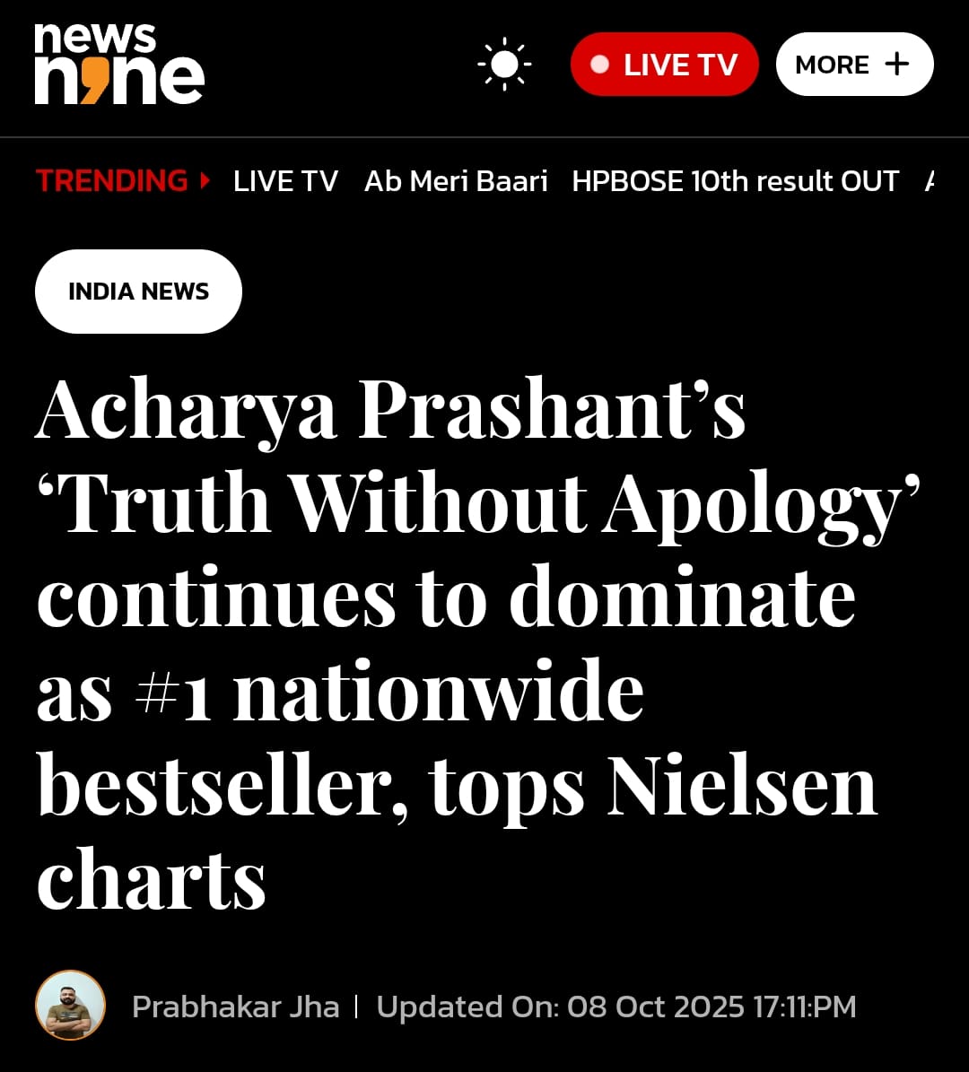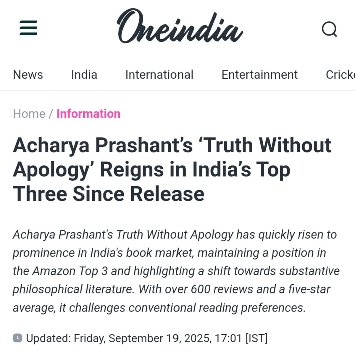 Media One IndiaOne India | "Acharya Prashant’s ‘Truth Without Apology’ Reigns in India’s Top Three Since Release" - Covered by Oneindia 19 Sep 2025 [1] [2] Acharya Prashant vs. The ‘Purity’ Police: How One Spiritual Leader is Fighting for India's Daughters 05 Aug 2025 [1] [2] |