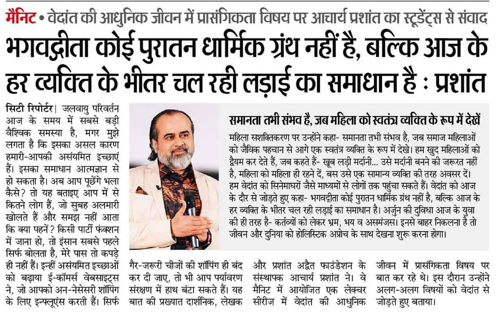 Media City BhaskarCity Bhaskar | Bhagavad GIta koi puratan dharmik granth nahin, balki aaj ke har vyakti ke bheetar chal rahi ladai ka samadhan hai. 24 Apr 2025 [1] |