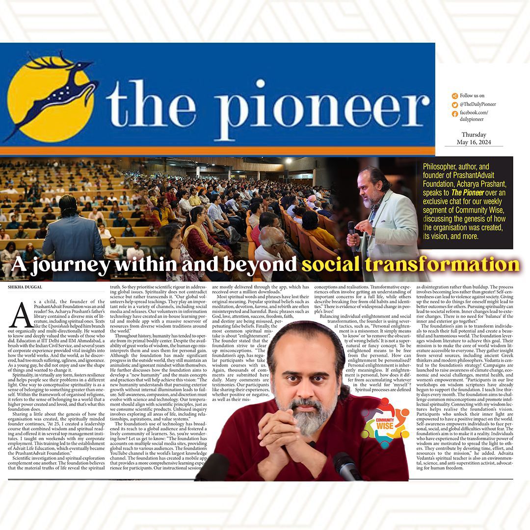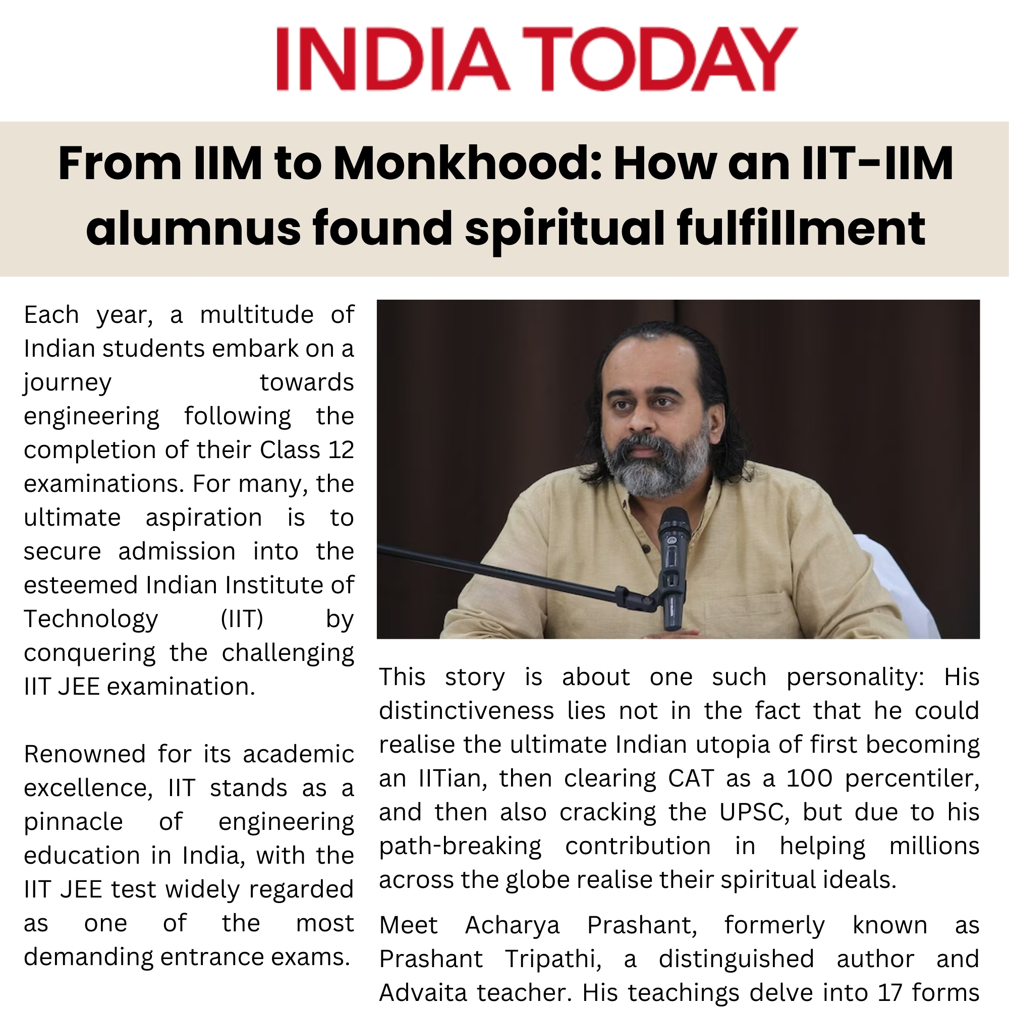 Media India TodayIndia Today | Acharya Prashant's article, 'A spiritual teacher's tips for youth to find purpose in today's world' published in India Today 04 Nov 2024 [1] India Today tweeted about Acharya Prashant’s article, 'A Spiritual Teacher’s Tips for Youth to Find Purpose in Today’s World.' 04 Nov 2024 [1] Acharya Prashant’s article 'From IIM to Monkhood: How an IIT-IIM Alumnus Found Spiritual Fulfillment' published in India Today 28 Feb 2024 [1] |