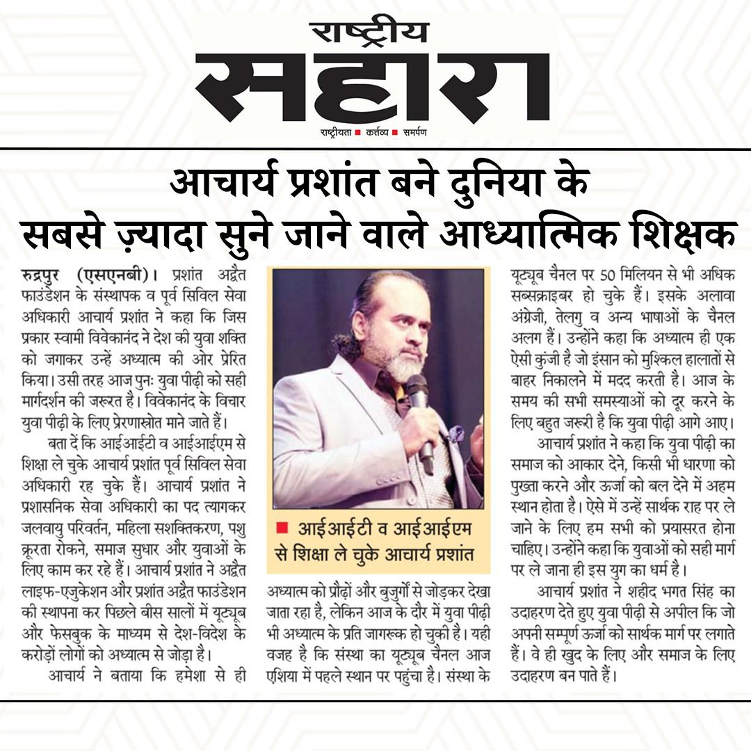 Media Rashtriya SaharaRashtriya Sahara | Acharya Prashant’s article 'Acharya Prashant bane duniya ke sabse zyada sune jane wale adhyatmik shikshak' published in Rashtriya Sahara 03 Jul 2024 [1] |