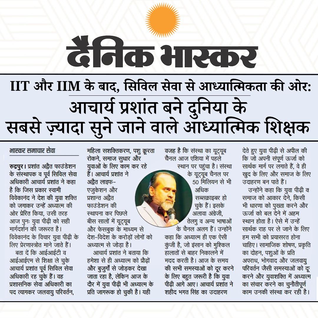 Media Dainik BhaskarDainik Bhaskar | Acharya Prashant’s article 'IIT aur IIM ke baad, Civil Seva se Adhyatmikta ki or: Acharya Prashant bane duniya ke sabse zyada sune jane wale adhyatmik shikshak' published in Dainik Bhaskar 04 Jul 2024 [1] |