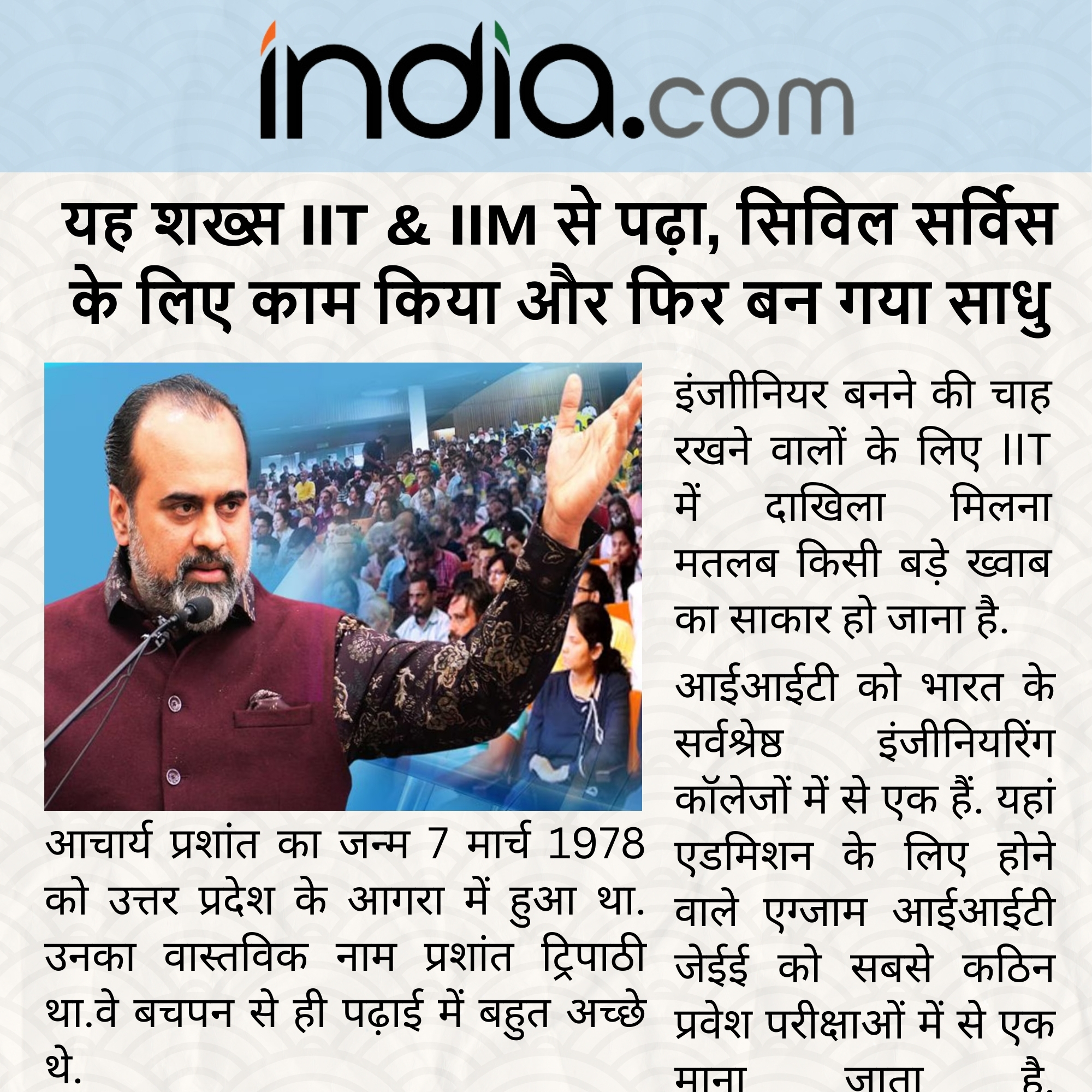 Media India.comIndia.com | Meet man, spiritual teacher who received special award from IIT Delhi for…., has huge number of followers, he is… 27 Apr 2025 [1] Acharya Prashant’s article 'Acharya Prashant Becomes Most Followed Spiritual Leader Globally on YouTube' published in India.com 05 Jul 2024 [1] |