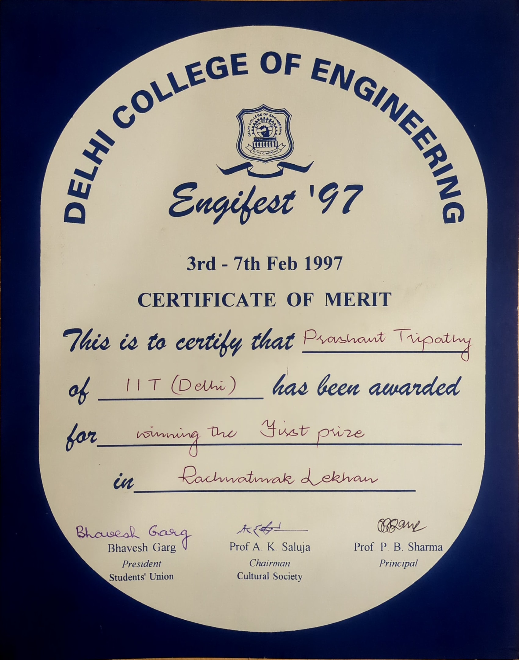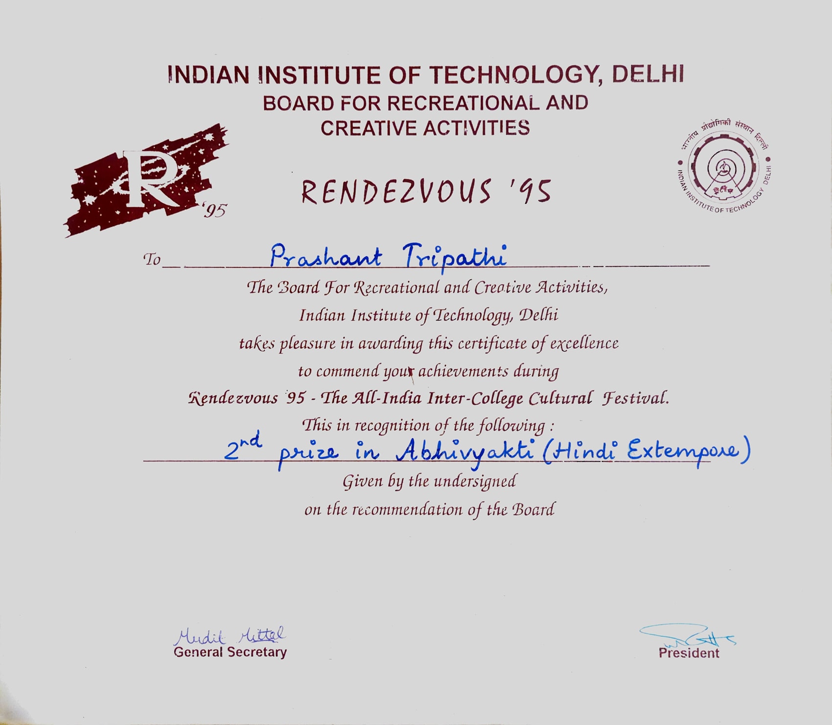 2nd Prize in Abhivyakti (Hindi Extempore), Redezvous, IITD.2nd Prize in Abhivyakti (Hindi Extempore), Redezvous, IITD.14 Aug 1999 [1] [1] [2] [2]