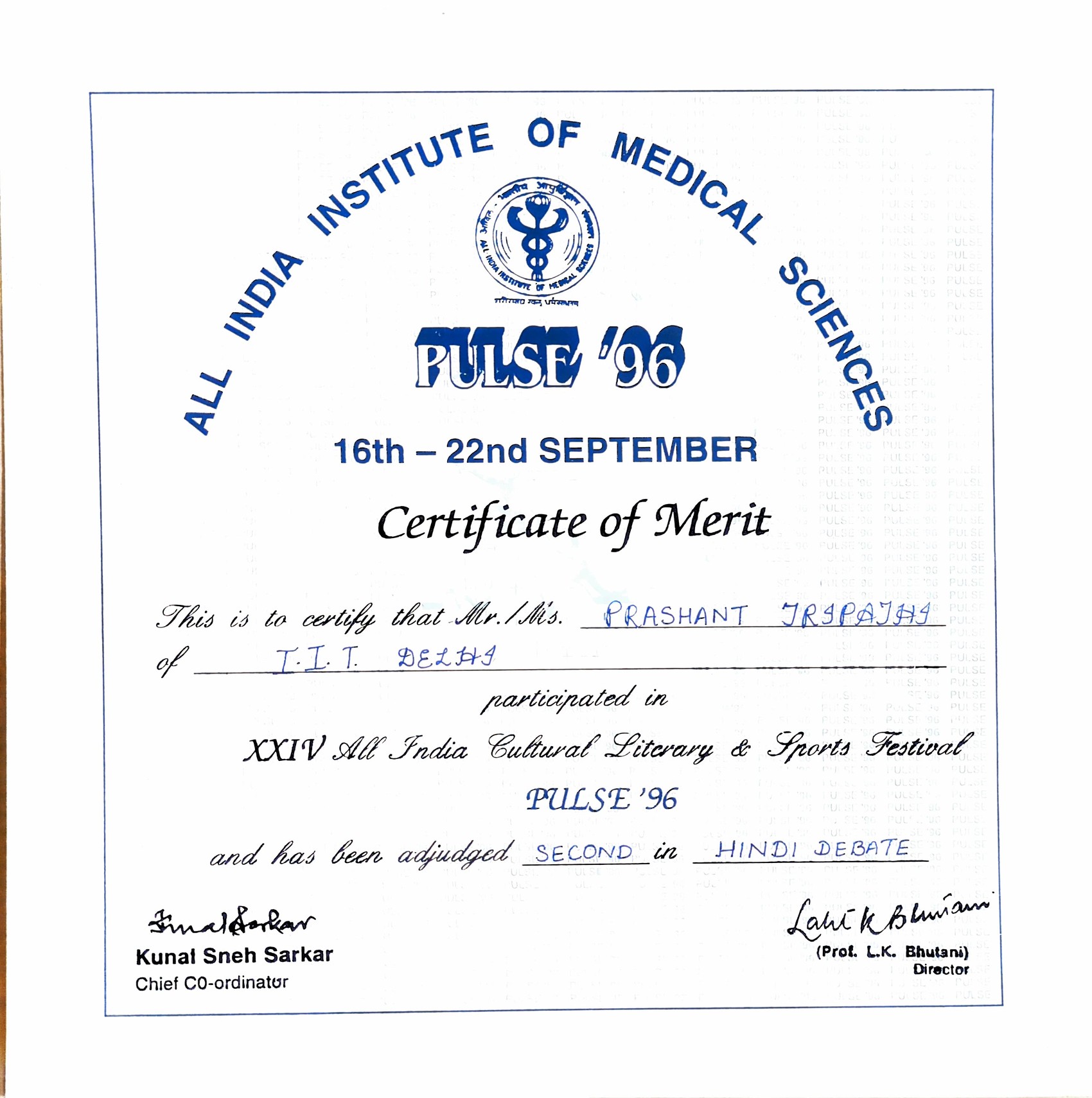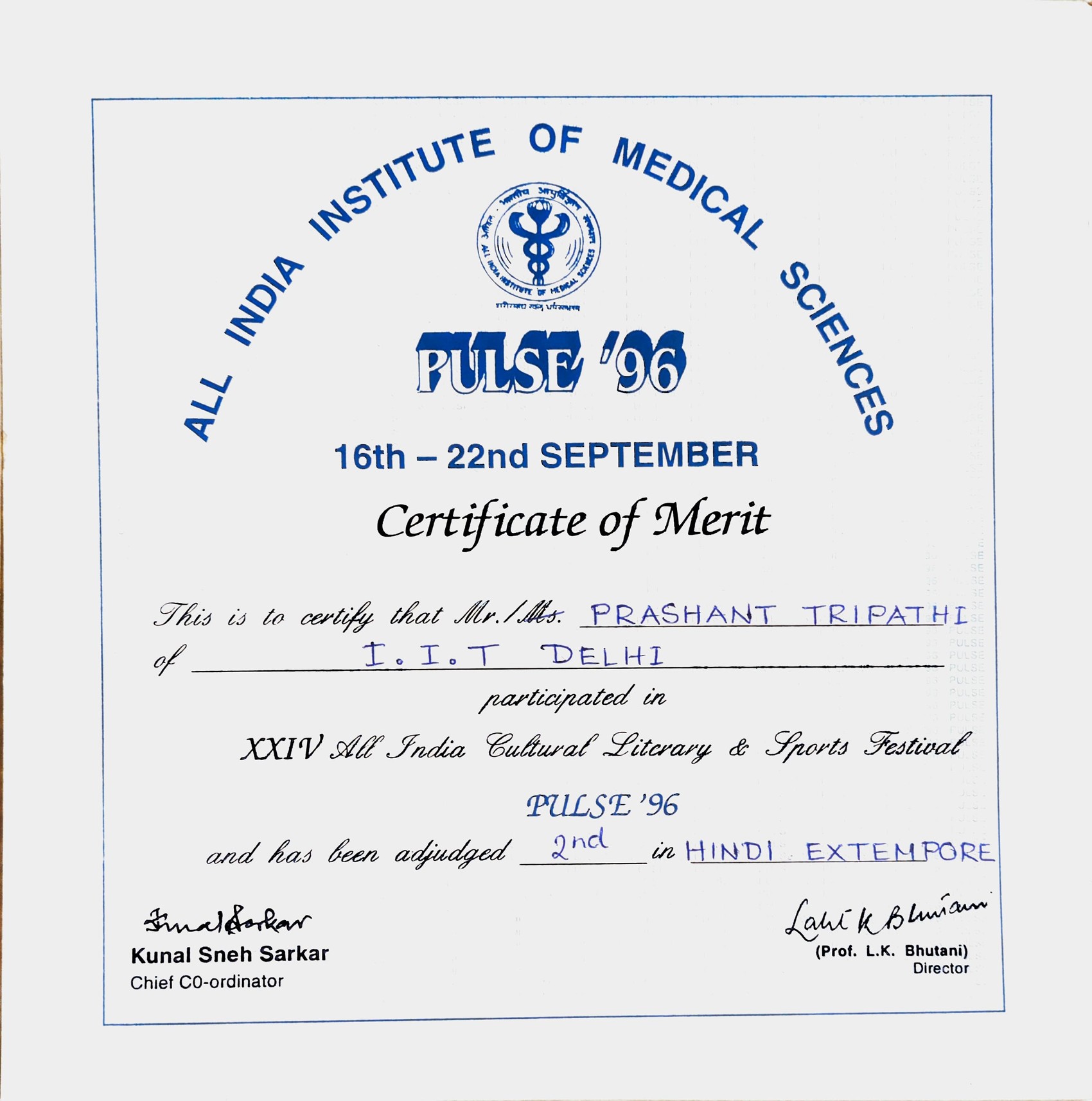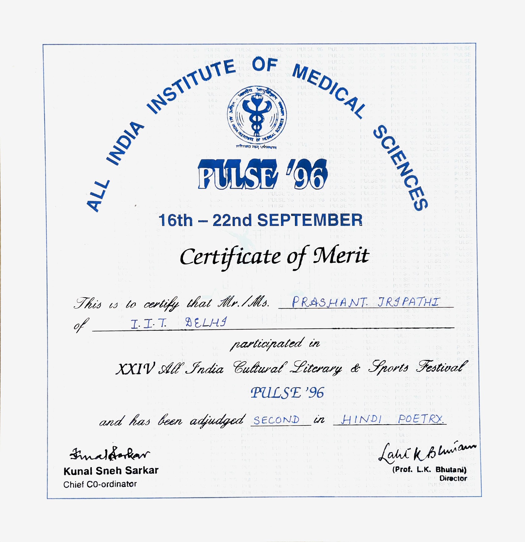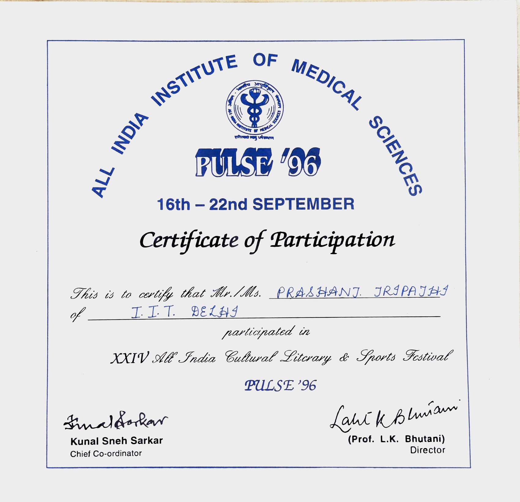 Recognition for Participation in All India Cultural, Literary and Sports Festival -- Pulse, AIIMS.Recognition for Participation in All India Cultural, Literary and Sports Festival -- Pulse, AIIMS.22 Sep 1996 [1] [1] [2] [2]