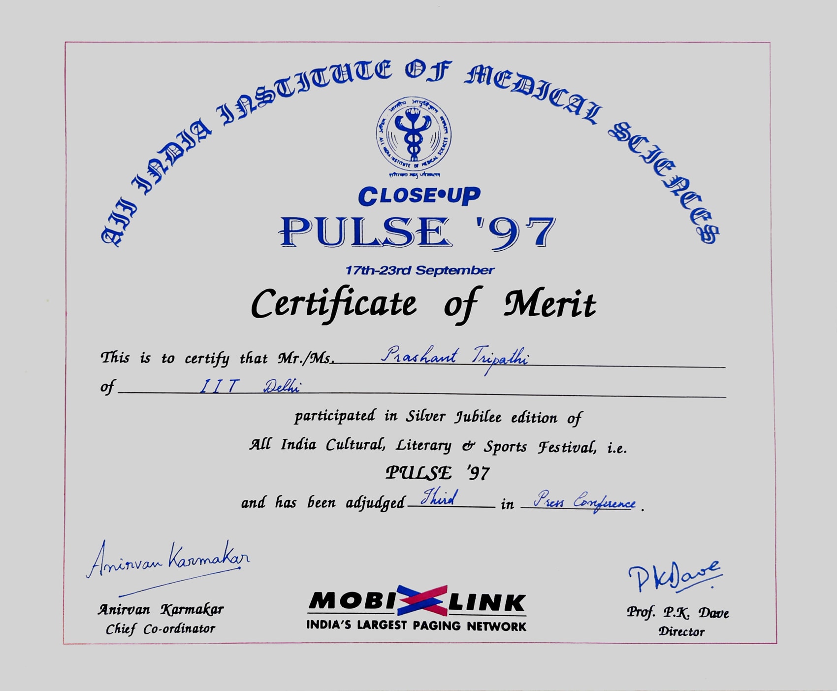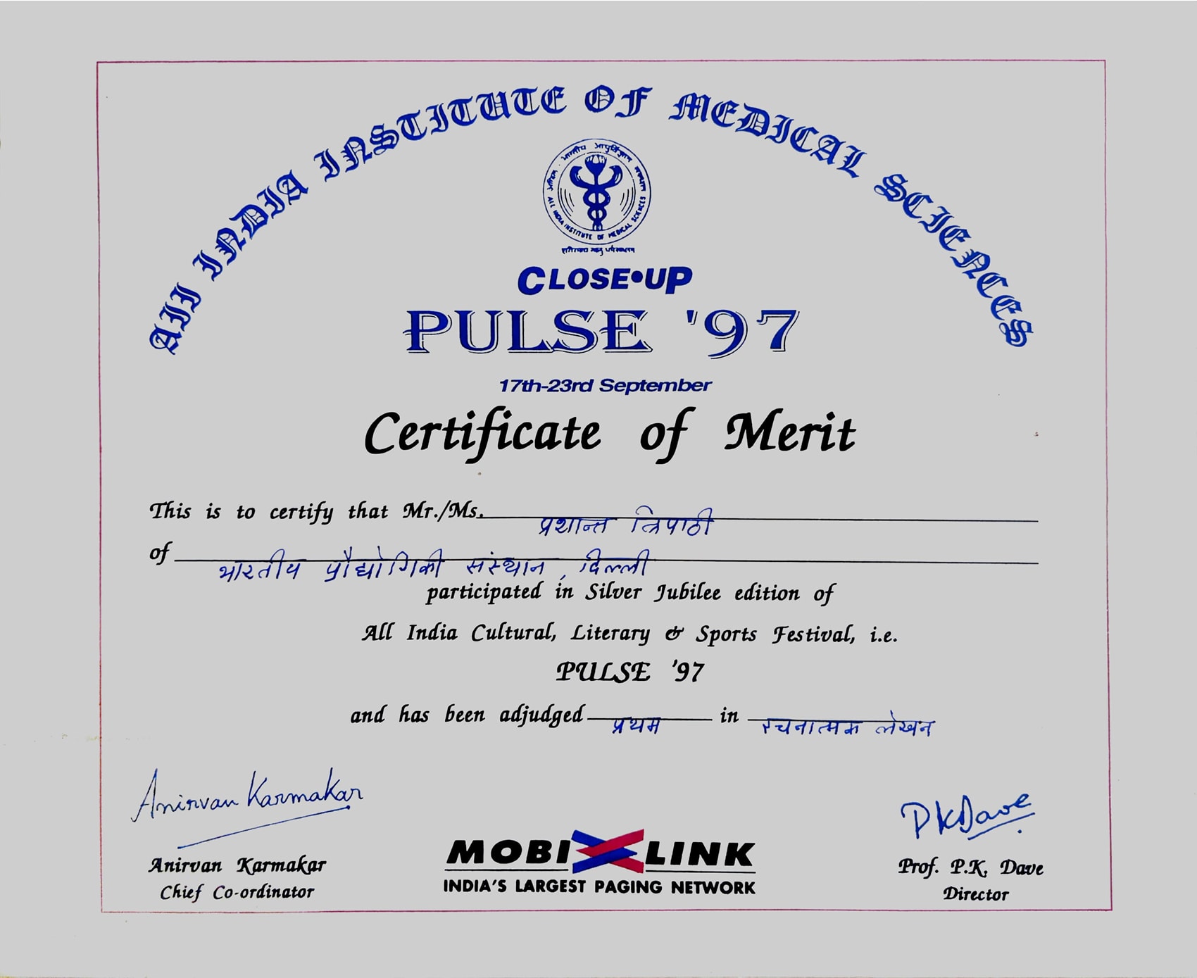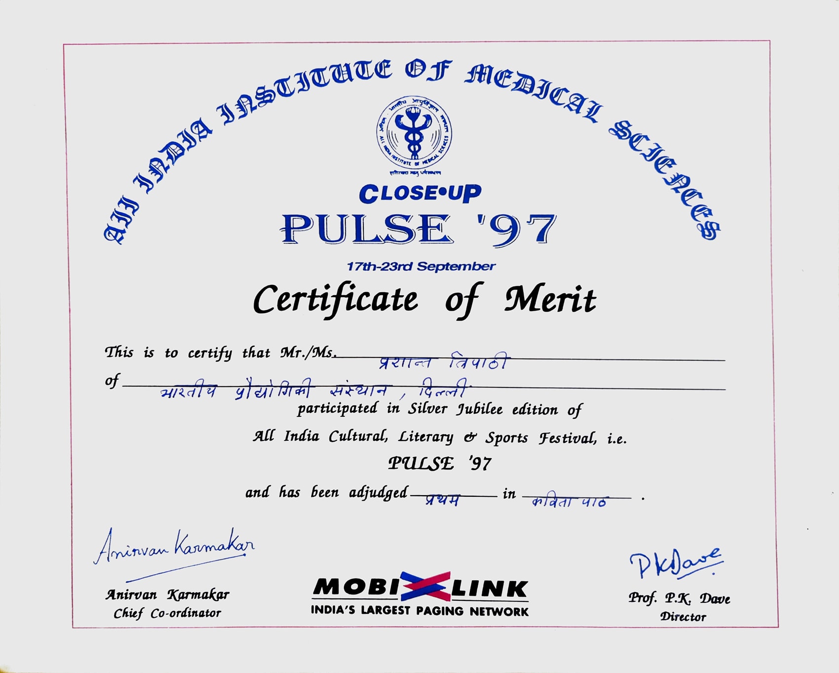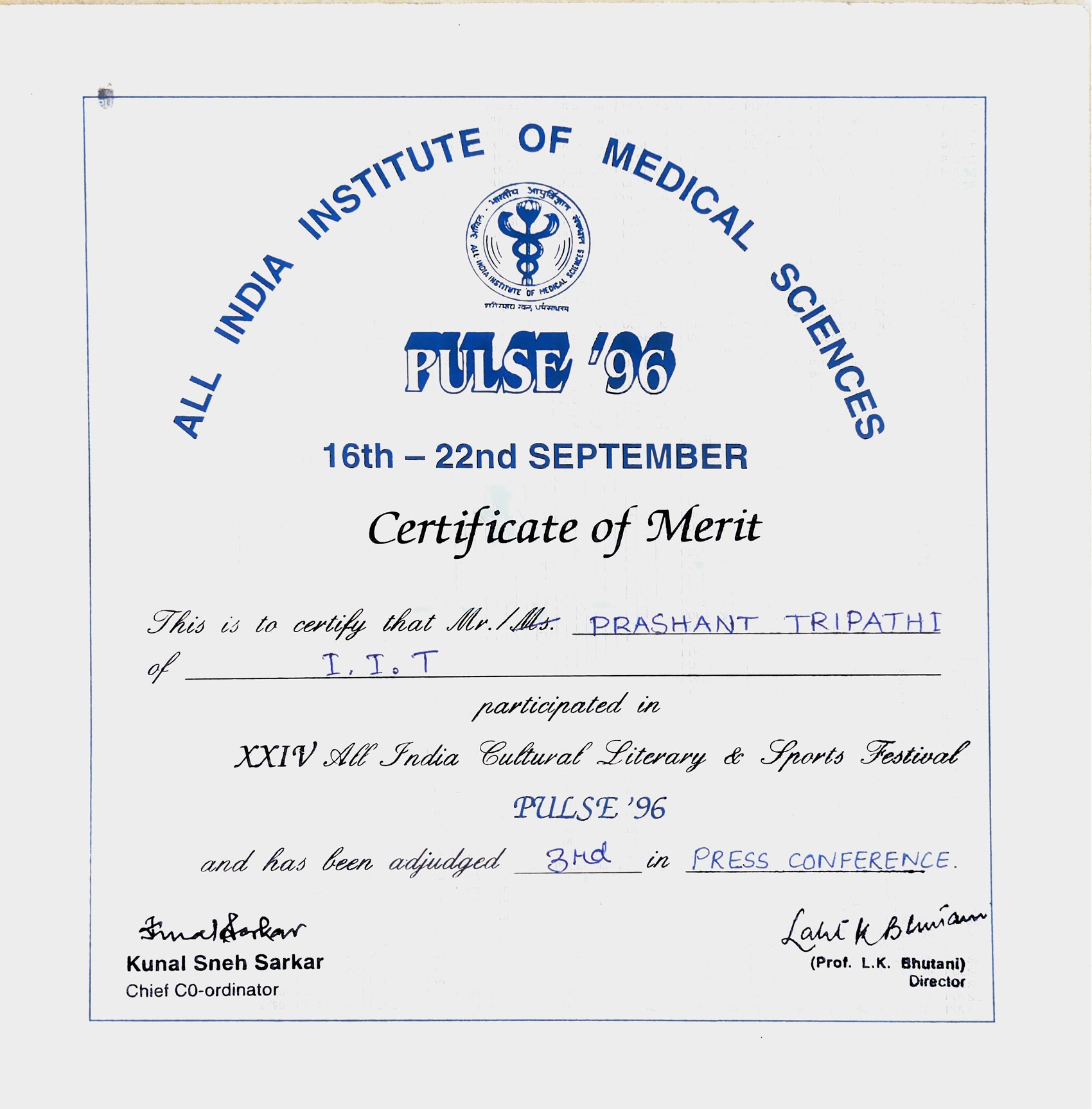 Recognition for Participation in All India Cultural, Literary and Sports Festival -- Pulse, AIIMS.Recognition for Participation in All India Cultural, Literary and Sports Festival -- Pulse, AIIMS.22 Sep 1996 [1] [1] [2] [2]