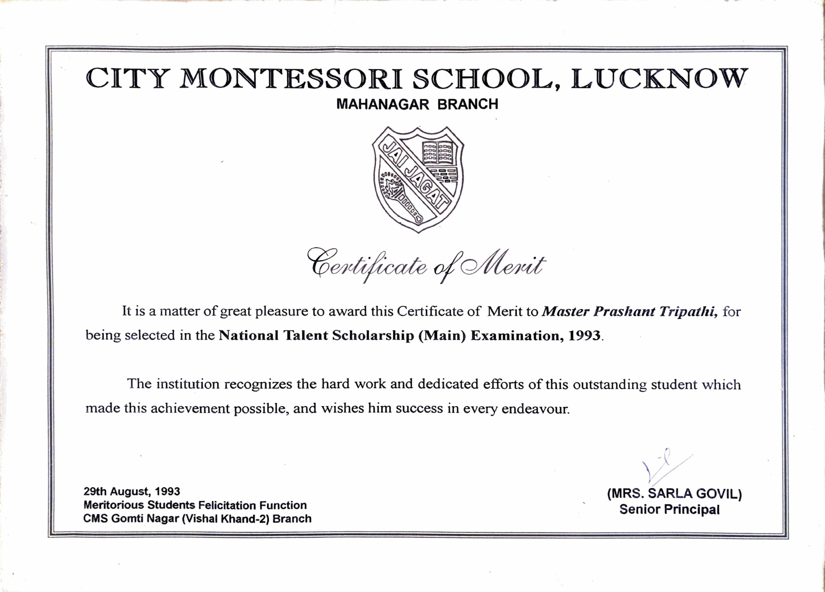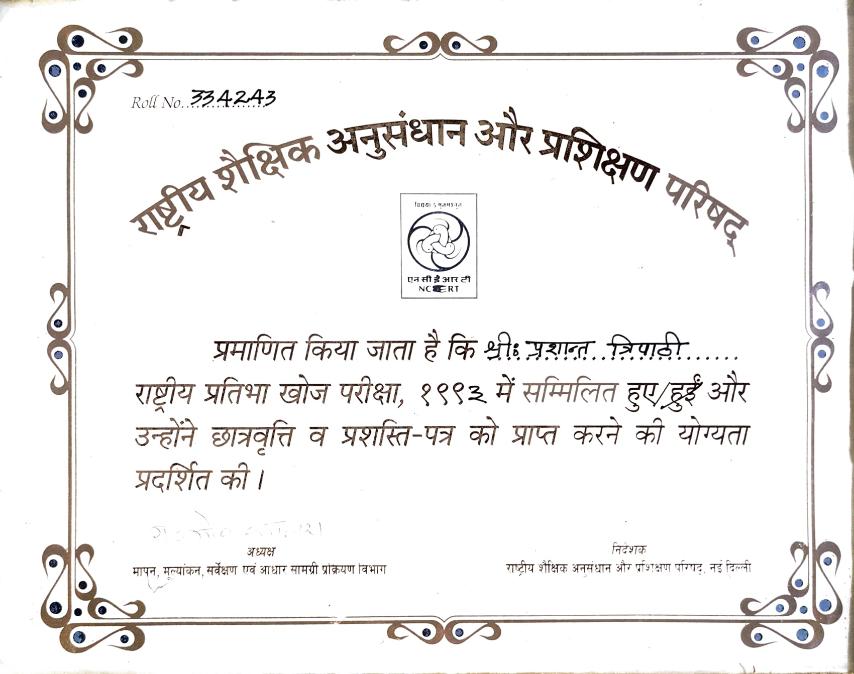 Being selected in the National Talent Scholarship (Main) Examination, 1993.