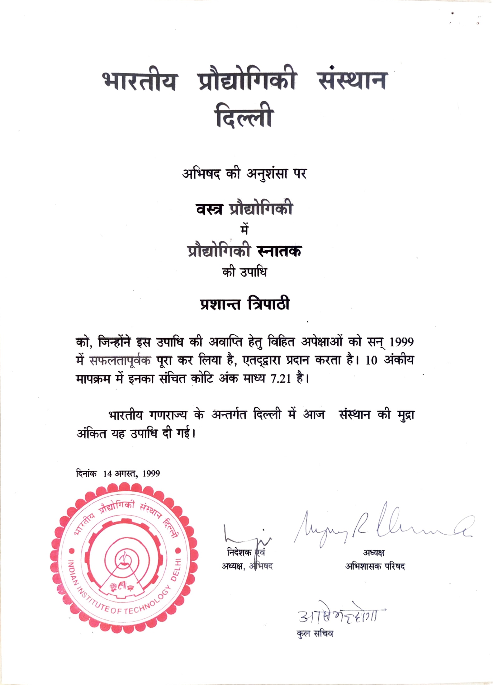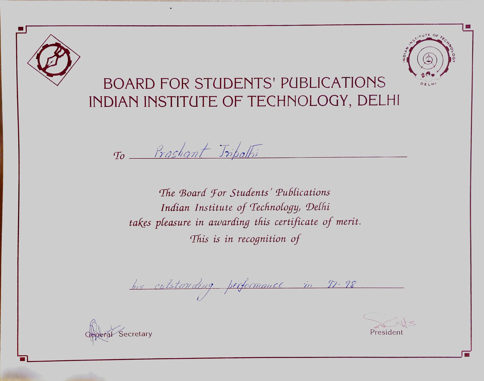 Board for Students' Publication, IIT Delhi awarded Acharya Prashant for his "Outstanding performance in 1997-98 session"Board for Students' Publication, IIT Delhi awarded Acharya Prashant for his "Outstanding performance in 1997-98 session"14 Aug 1998 [1] [1] [2] [2]