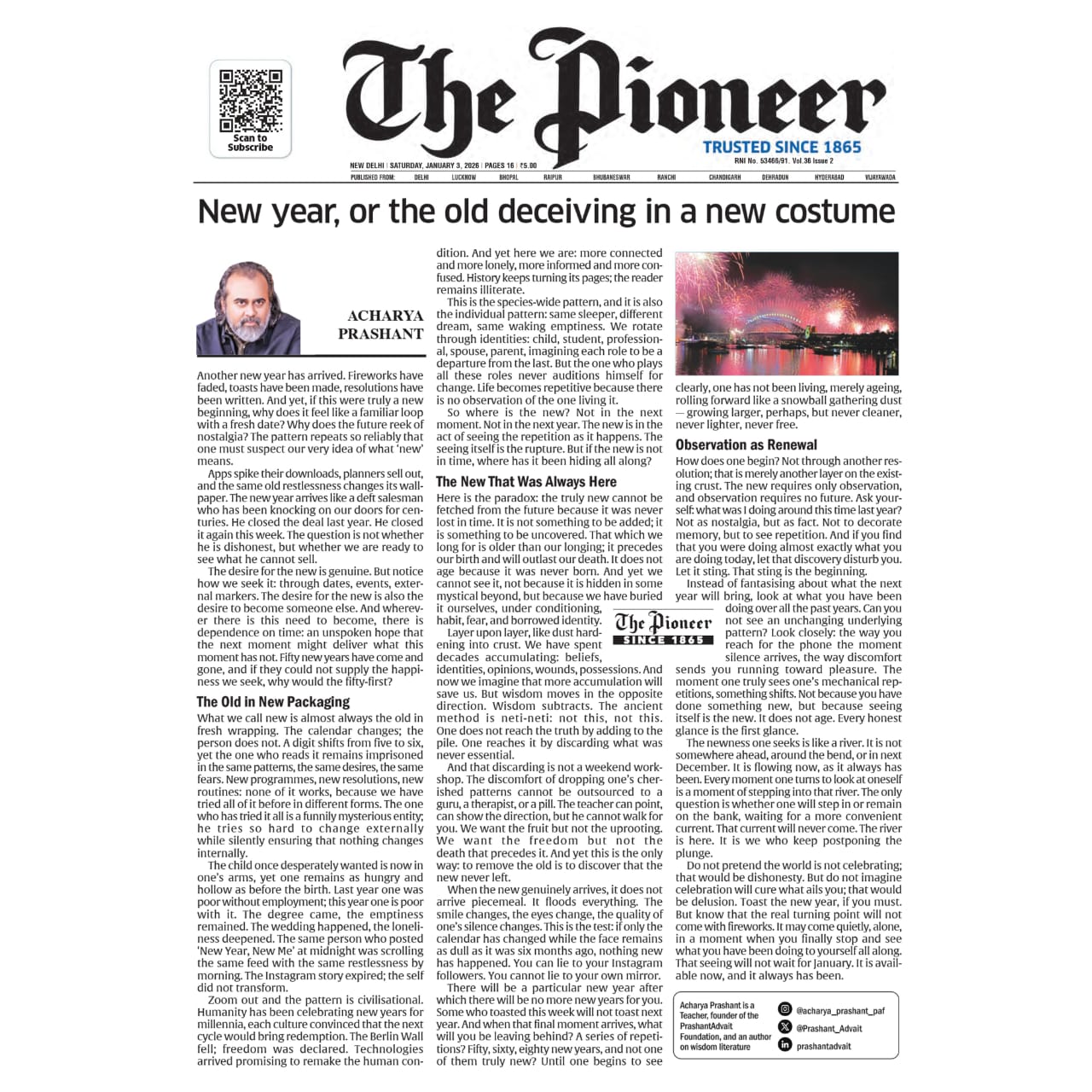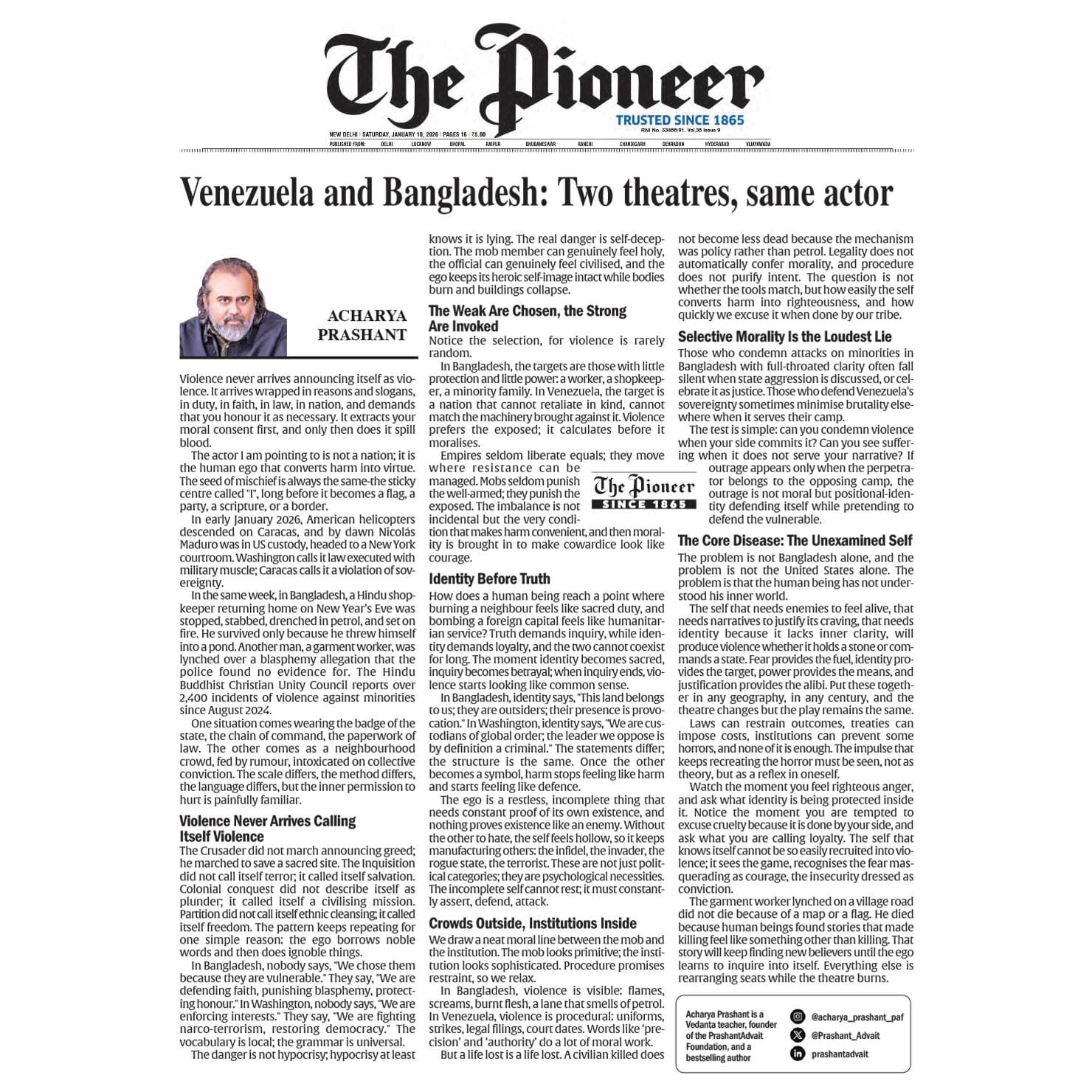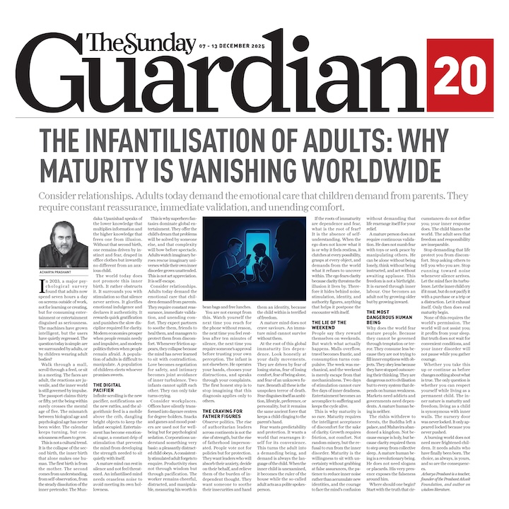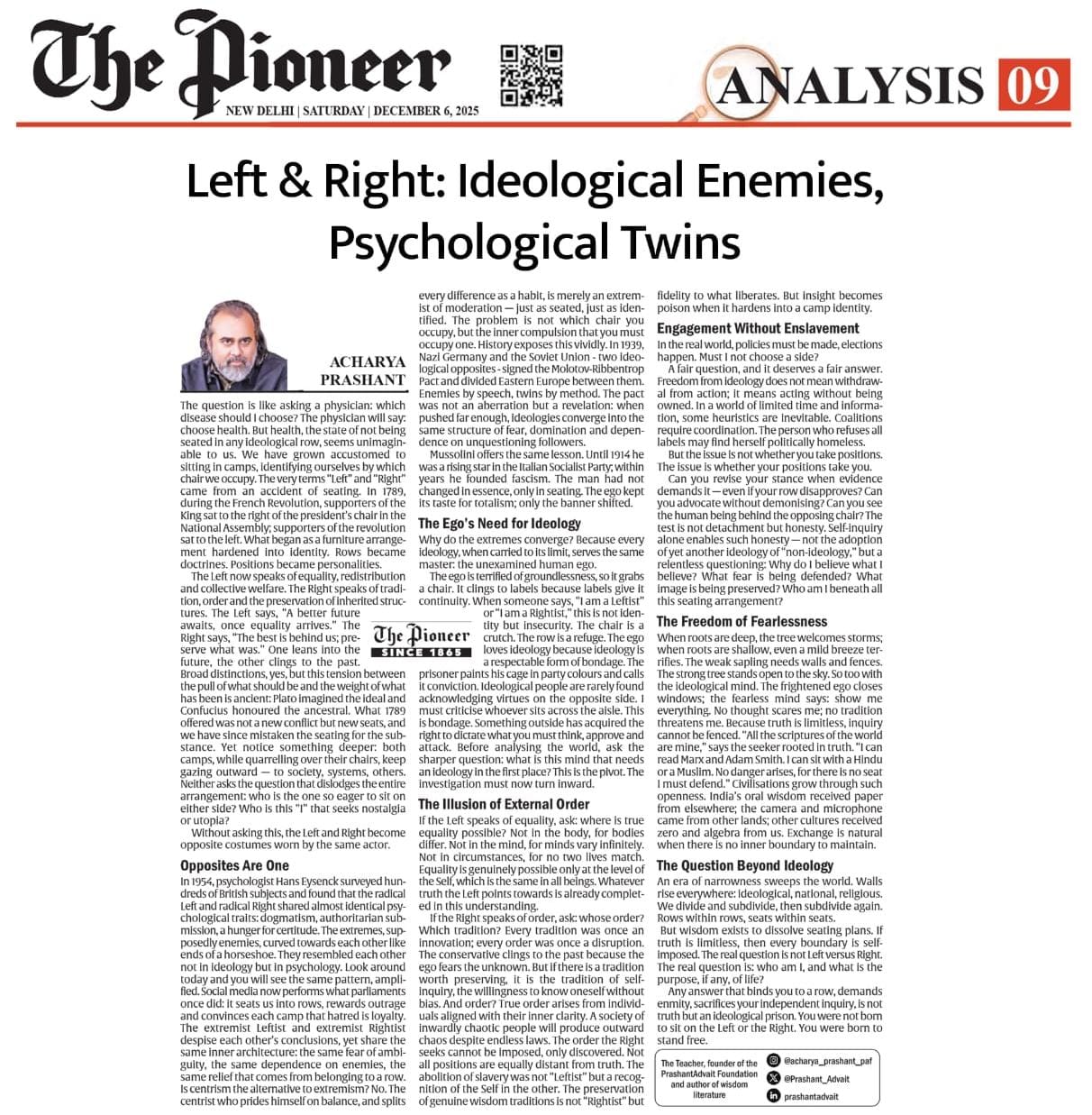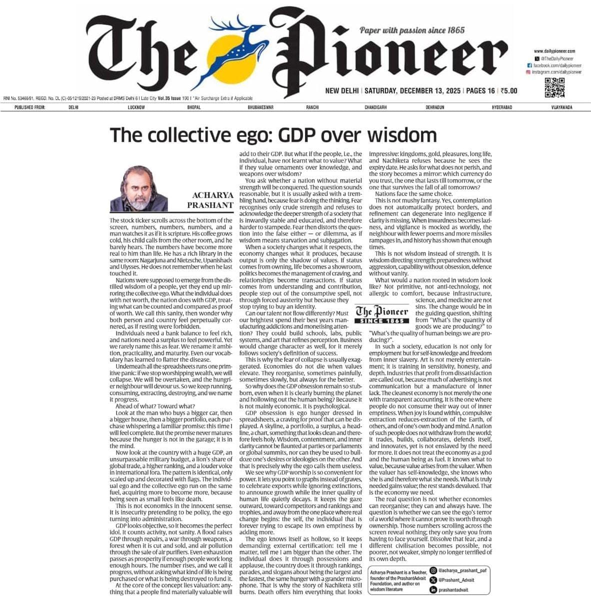 Media The Free Press JournalThe Free Press Journal | Acharya Prashant Featured Among the Top 5 Most Impactful Living Philosophers in 2025 19 Nov 2025 [1] [2] “After #1 On Amazon And Nielsen, ‘Truth Without Apology’ Now Dominates Flipkart Bestseller Charts” 24 Oct 2025 [1] [2] Free Press Journal - "Acharya Prashant: India’s Most Followed Philosophical Voice On Instagram" 20 Aug 2025 [1] [2] Seventeen Hours With The Gita: A Living Janmashtami Where PVR INOX Multiplexes Turned Into Temples Of Reflection 18 Aug 2025 [1] [2] |