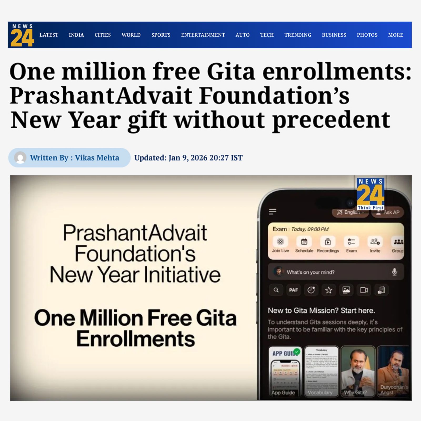 Media News 24News 24 | One million free Gita enrollments: Prashant Advait Foundation’s New Year gift without precedent 09 Jan 2026 [1] [2] When BJP and Congress Both Shared Acharya Prashant's Viral Video on X: News24's Report 02 Aug 2025 [1] [2] |
